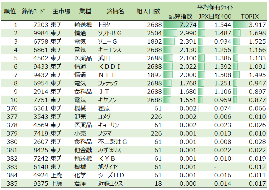 (1)試算指数構成個別銘柄平均保有ウェイト上位/下位10位