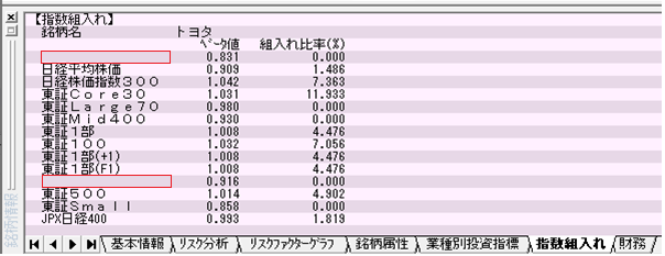 個別銘柄分析ウィンドウにおいて「指数組入れ」を選択すると、「JASDAQ」および「東証2部」の表示が消えます。