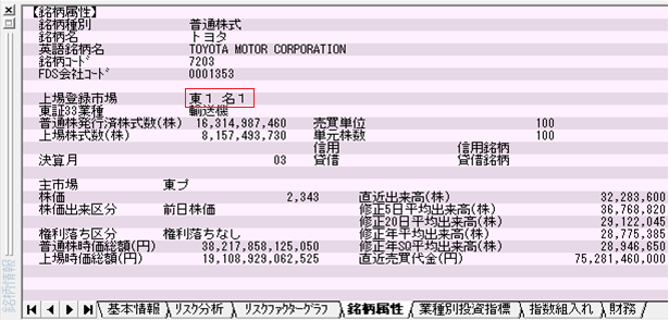 個別銘柄分析ウィンドウにおいて「銘柄属性」を選択すると、上場登録市場として東証・名証市場区分再編前の市場名が表示されます。
