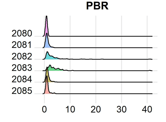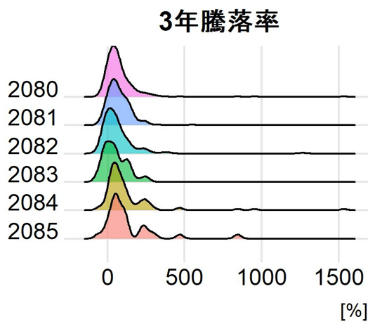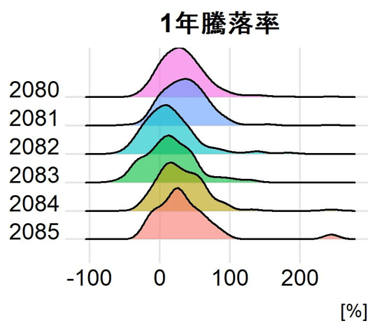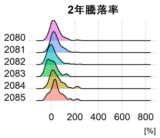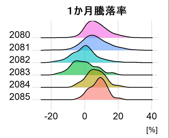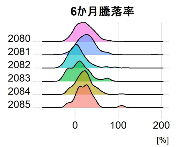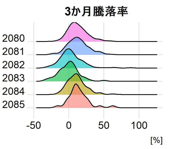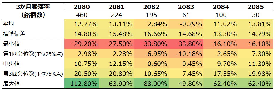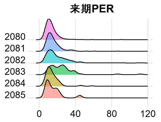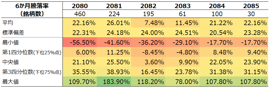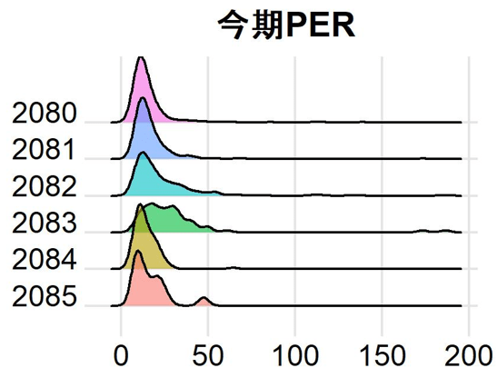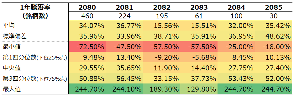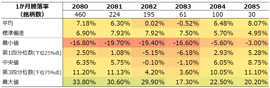 2080,2081,2084,2085は似たような分布形状をしています(ただし2085は構成銘柄数が少ないため、強く歪んでいます。)。他方で2082,2083は右裾が長い傾向にあります。