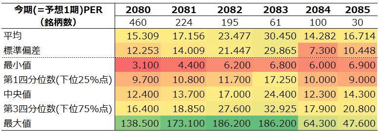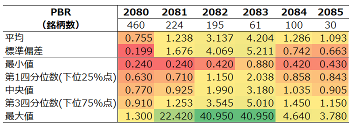 バリュー色の強い2080,2081,2084,2085はPBR1倍近辺に最頻値がある一方で、グロース色の強い2082,2083は右裾が長い(=高PBR銘柄が存在する)という傾向が見られます。