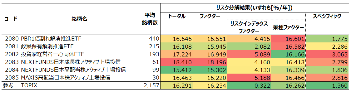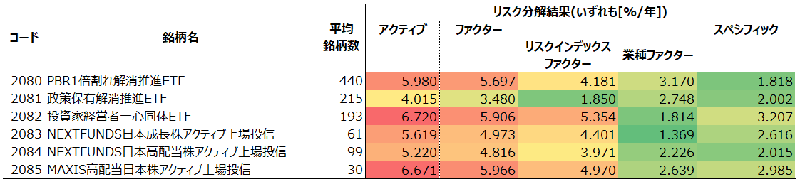 なお、NEXT FUNDS日本成長株アクティブ上場投信(2083)およびNEXT FUNDS日本高配当株アクティブ上場投信(2084)は想定トラッキングエラー(アクティブリスク)をそれぞれ8%/年および6%/年~8%/年とすると公開しており、いずれの推計リスクもその水準内に収まっていることが確認できます。