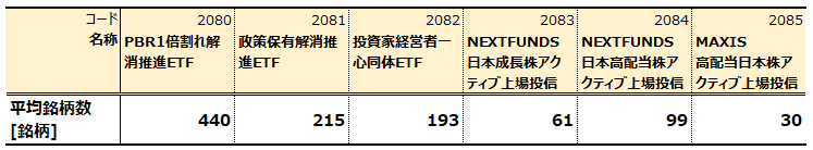 ETF別の平均保有銘柄数は以下の【表1】のとおりでした。