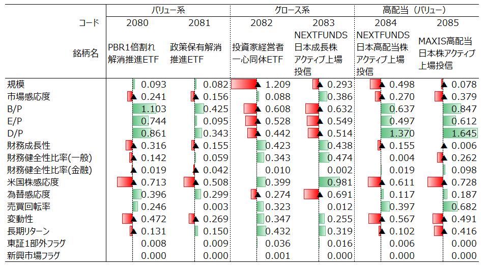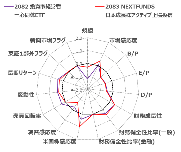 2083は財務成長性やB/P、E/P、そしてD/Pの水準が2082と類似しており、こちらもグロース色の強い銘柄と推察されます。これに対し、規模や市場感応度・米国感応度の水準が2082よりも高く、2083の方が2082よりも大型で市場全体の動向と連動しやすいという相違点が確認できます。