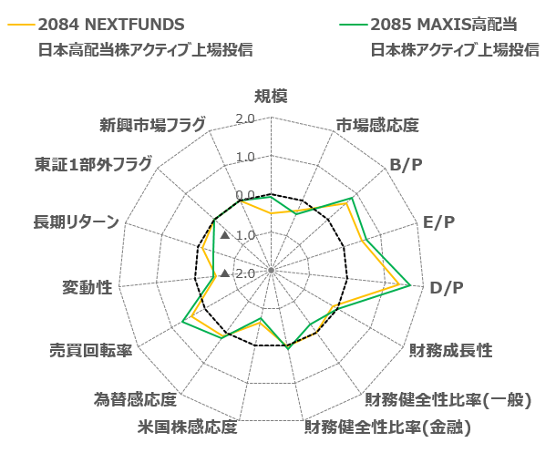 2084と2085は共に高配当戦略を取っていますが、2085の方がより大型であり、それに伴いD/PをはじめとしてB/P、E/P、そして売買回転率の水準も高いと推察されます。他方で財務的な安全性は2084の方が高くなっています。